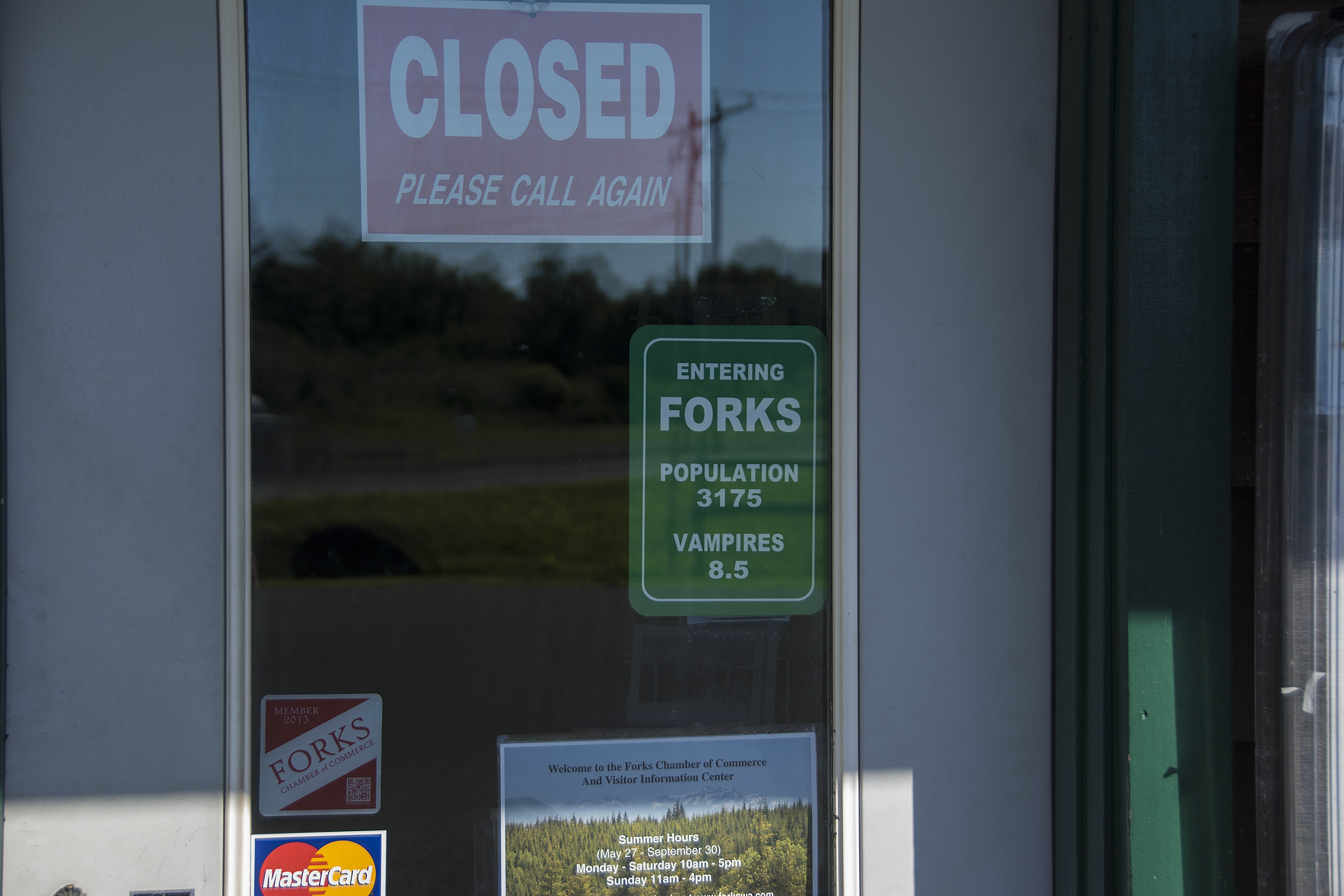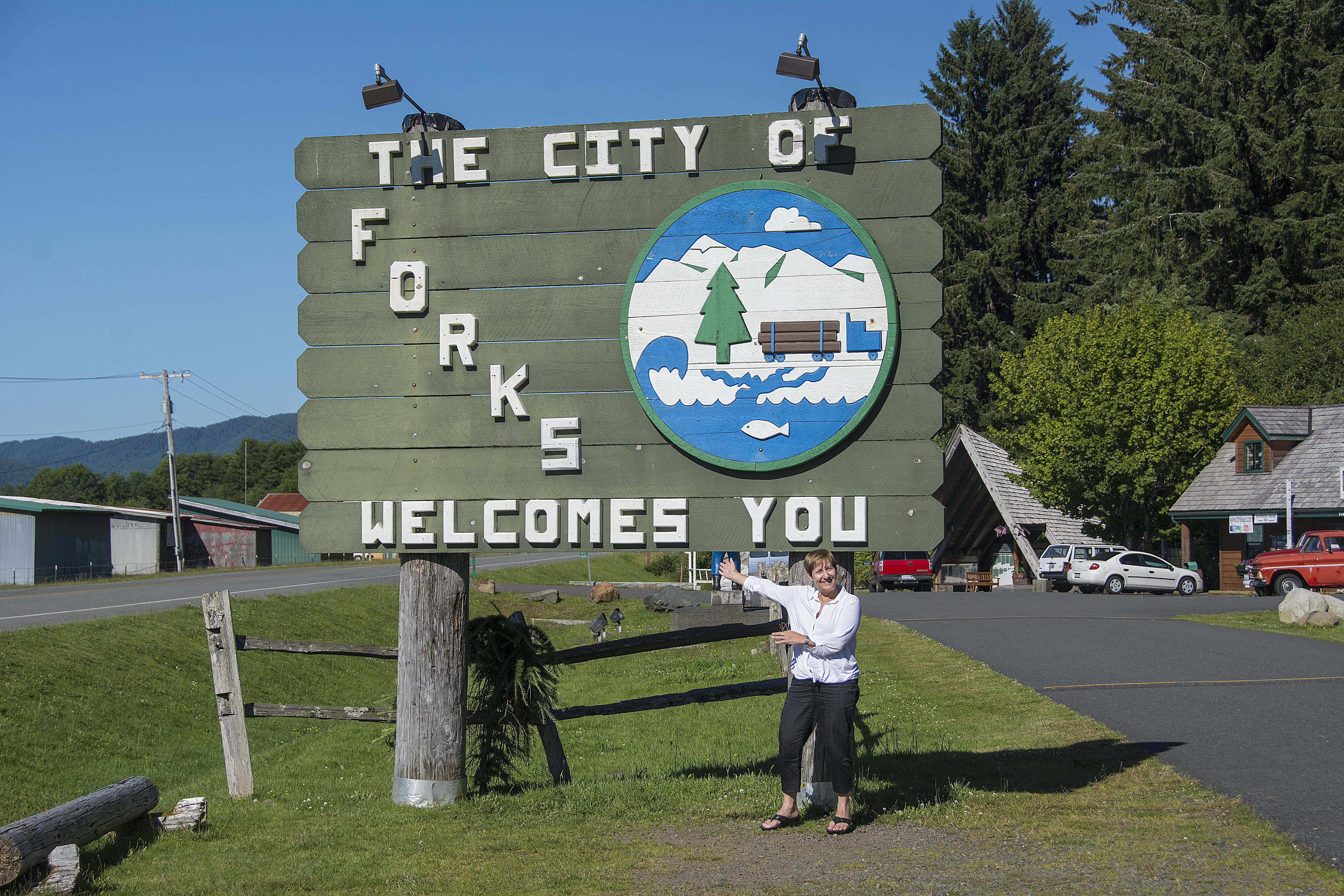 The drive from there to Forks was very pleasant, mostly along roads lined with fir trees and you can imagine my excitement when we entered Forks and there was the ‘Welcome’ sign that is so familiar to all of us Twilight fans. To make it even better, there was Bella’s truck and a funny sign in the window of the Chamber of Commerce